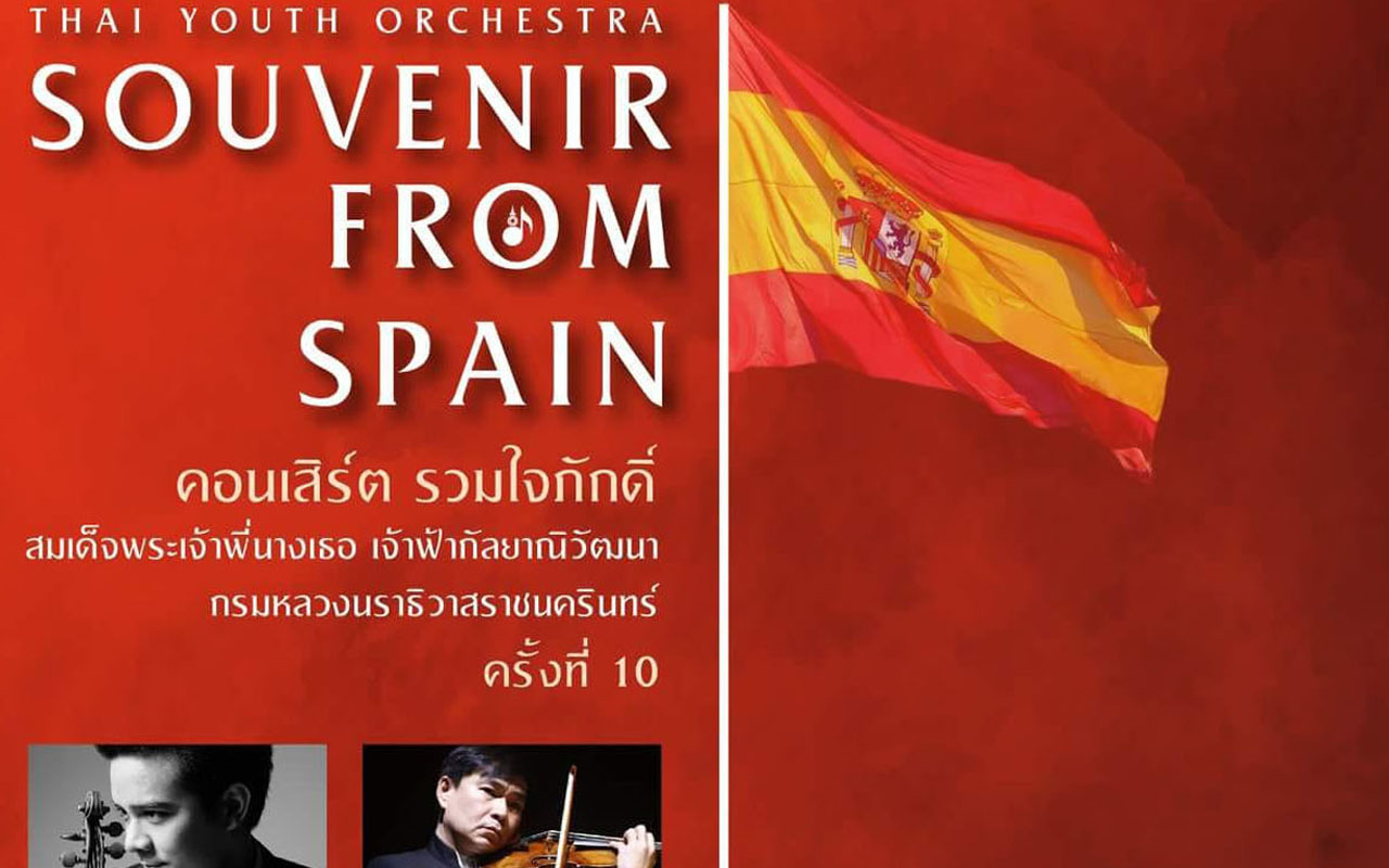 ขอเชิญชวนทุกท่านมาร่วมเดินทางสู่ดินแดนแห่งความฝันผ่านบทเพลงในคอนเสิร์ต “SOUVENIR FROM SPAIN” ซึ่งเป็นการแสดง “รวมใจภักดิ์” ครั้งที่ 10 โดยฝีมือของเหล่านักดนตรีเยาวชนผู้เปี่ยมพรสวรรค์จากวง Thai Youth Orchestra (TYO)